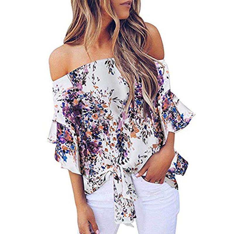 Summer Floral Print Chiffon Blouse Women Off Shoulder Flare Sleeve