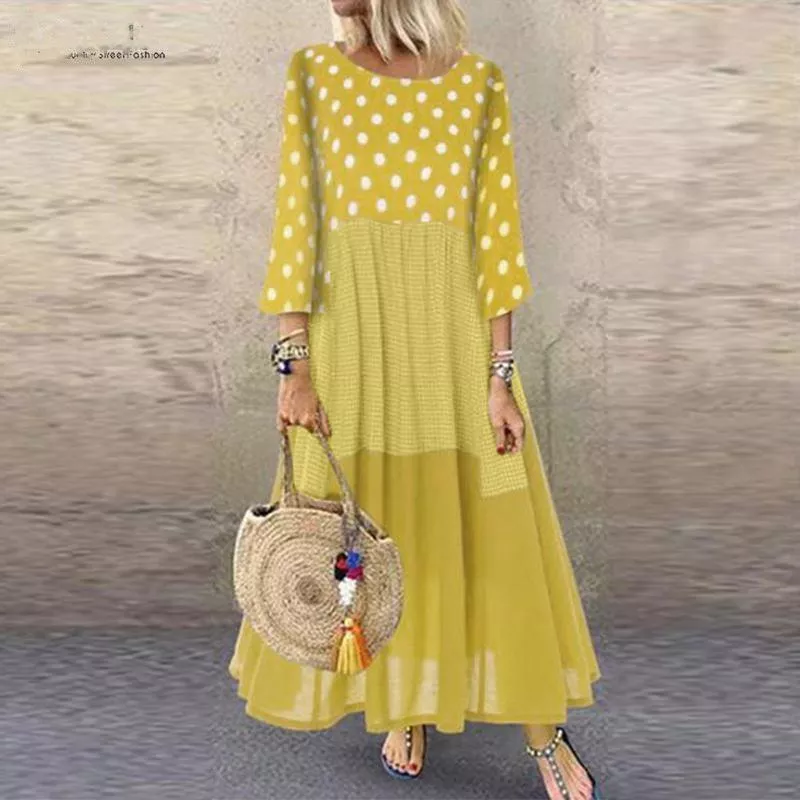 Women Polka Dot Long Sundress Autumn Vintage Pacthwork Dress Casual Cotton Shirt