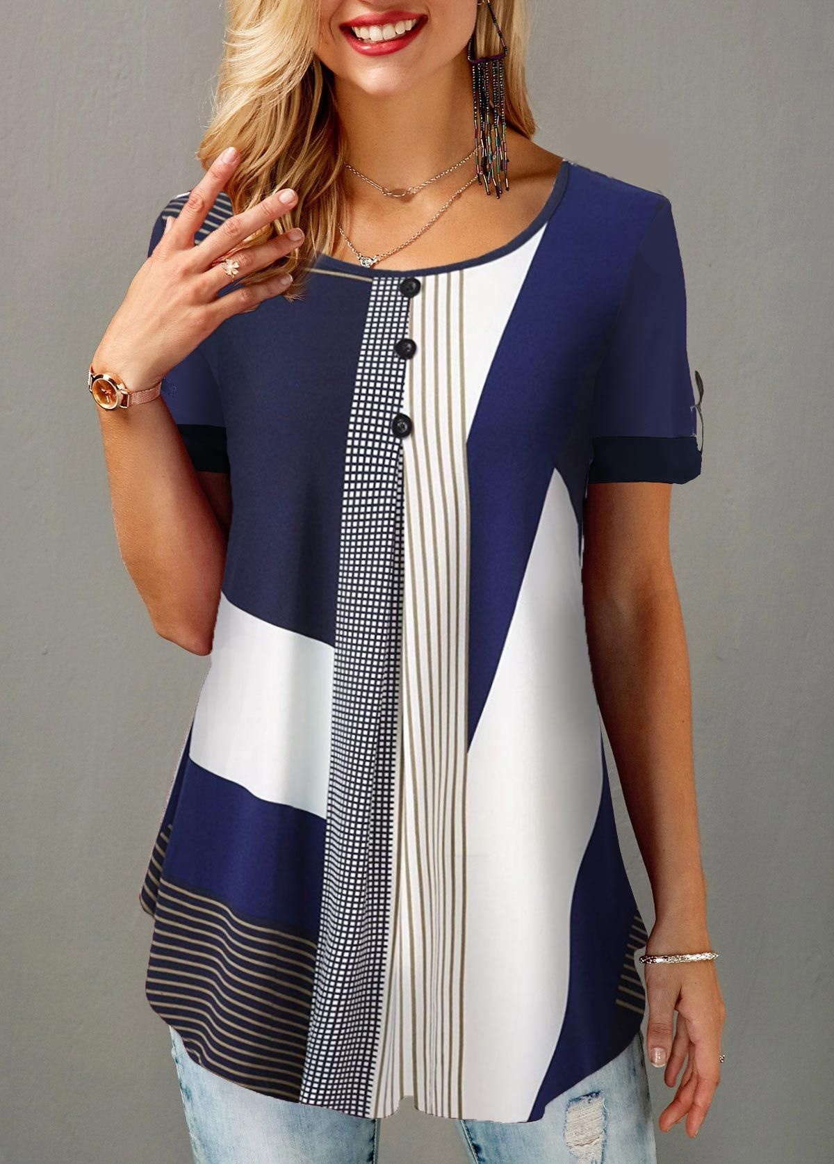 Summer Women Loose Casual Printed Round Neck Short Sleeves Blouse Shirts Summer Tops