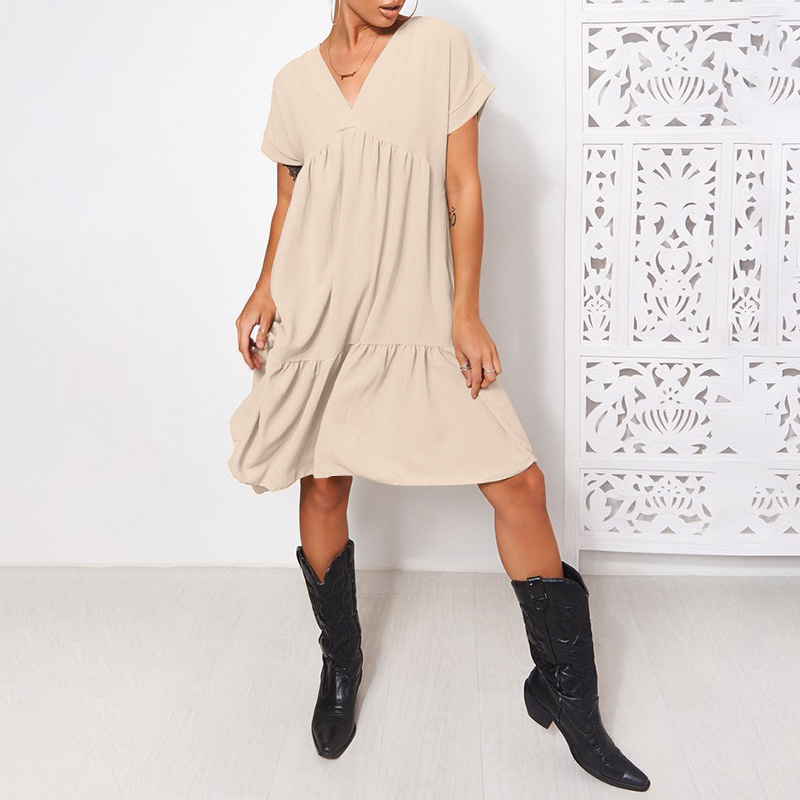 Sundress Women V Neck Short Sleeve Solid Dress
