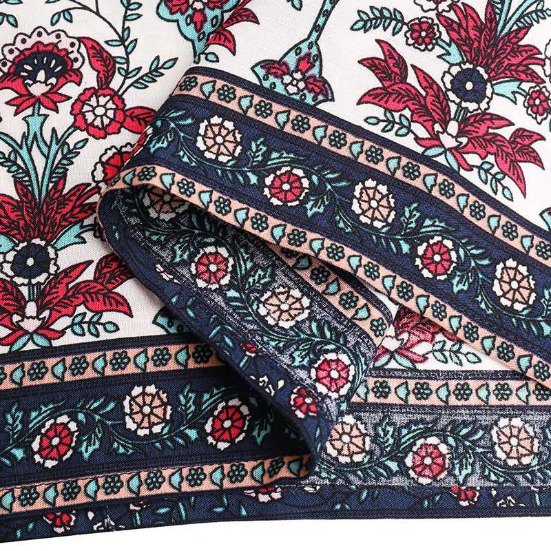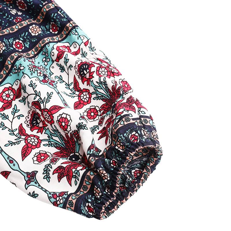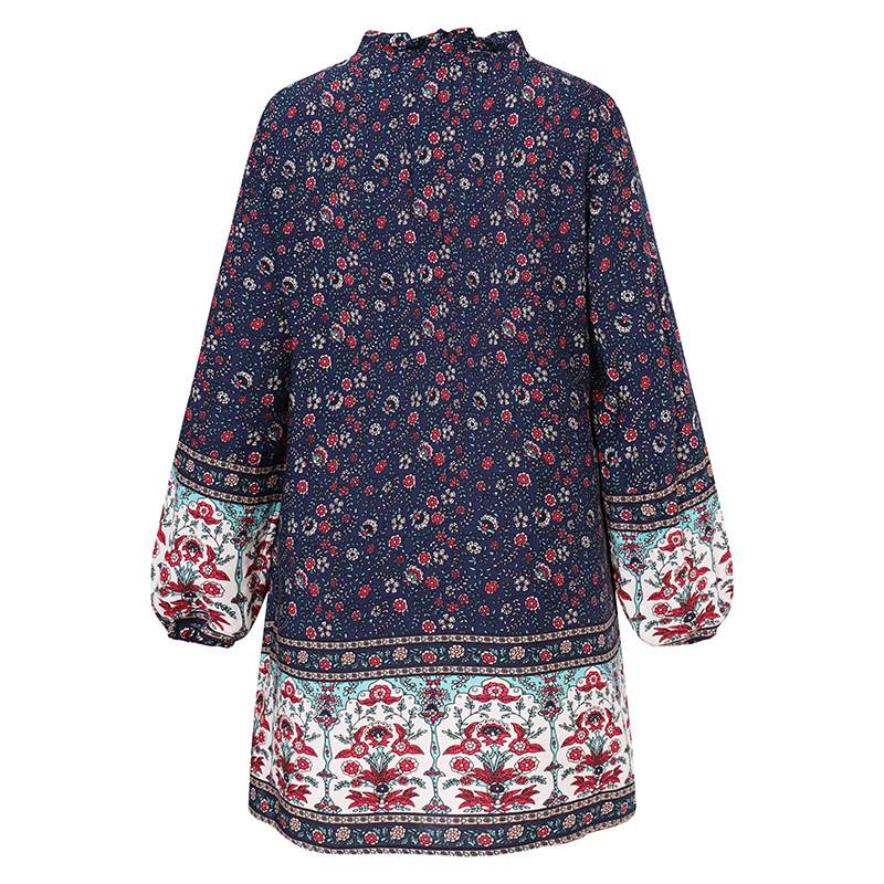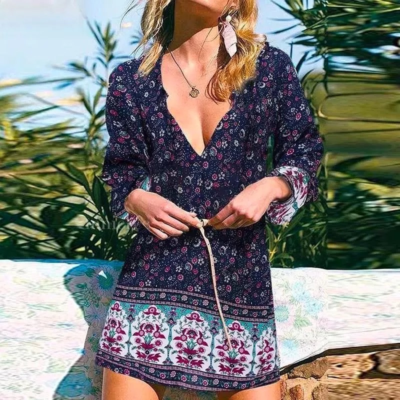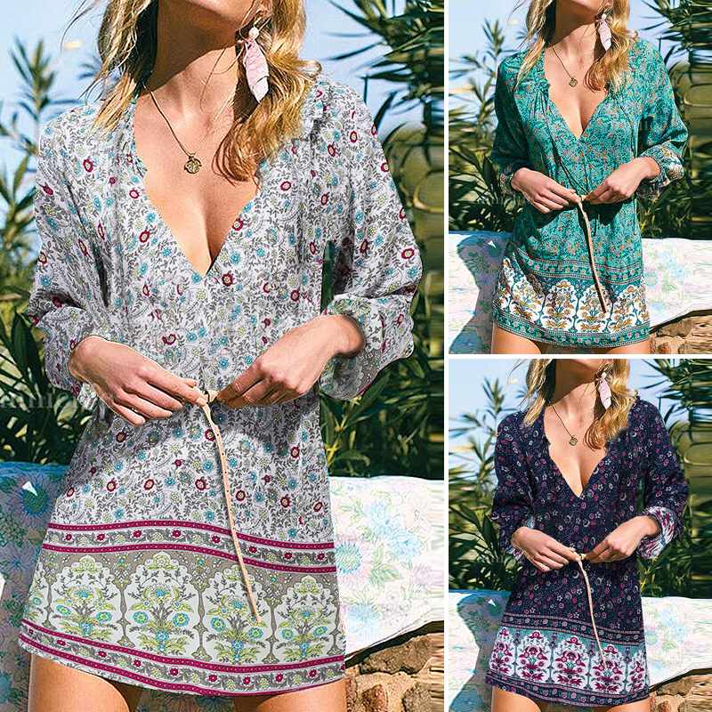 Summer Bohemian Blouse Women V Neck Long Sleeve Floral Printed Shirt Beach Mini Vestidos