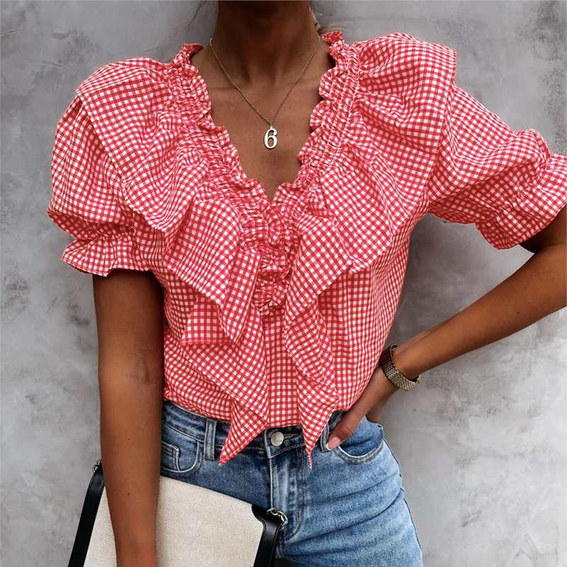 Women Ruffles Plaid Checked Blouse Vintage V Neck Short Sleeve