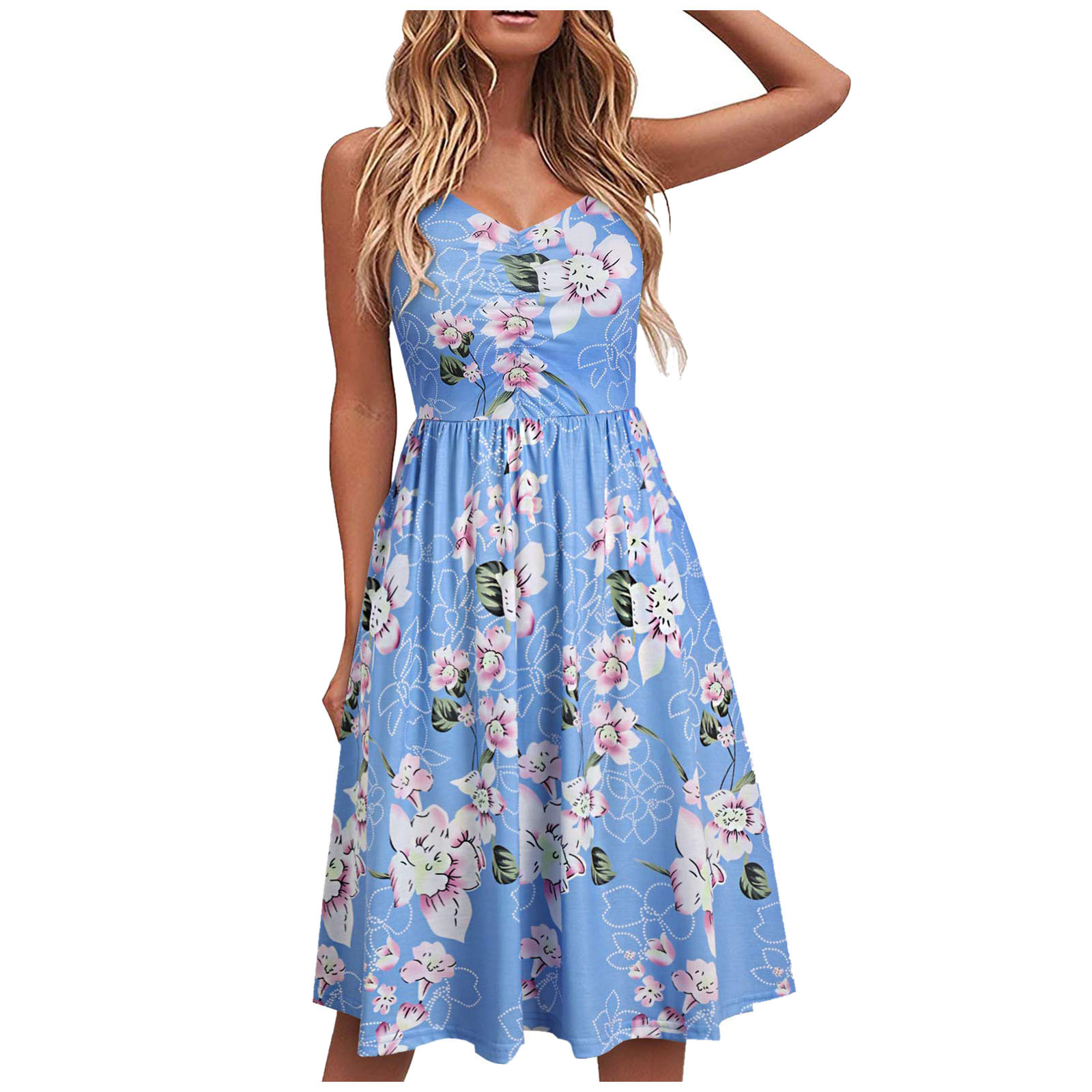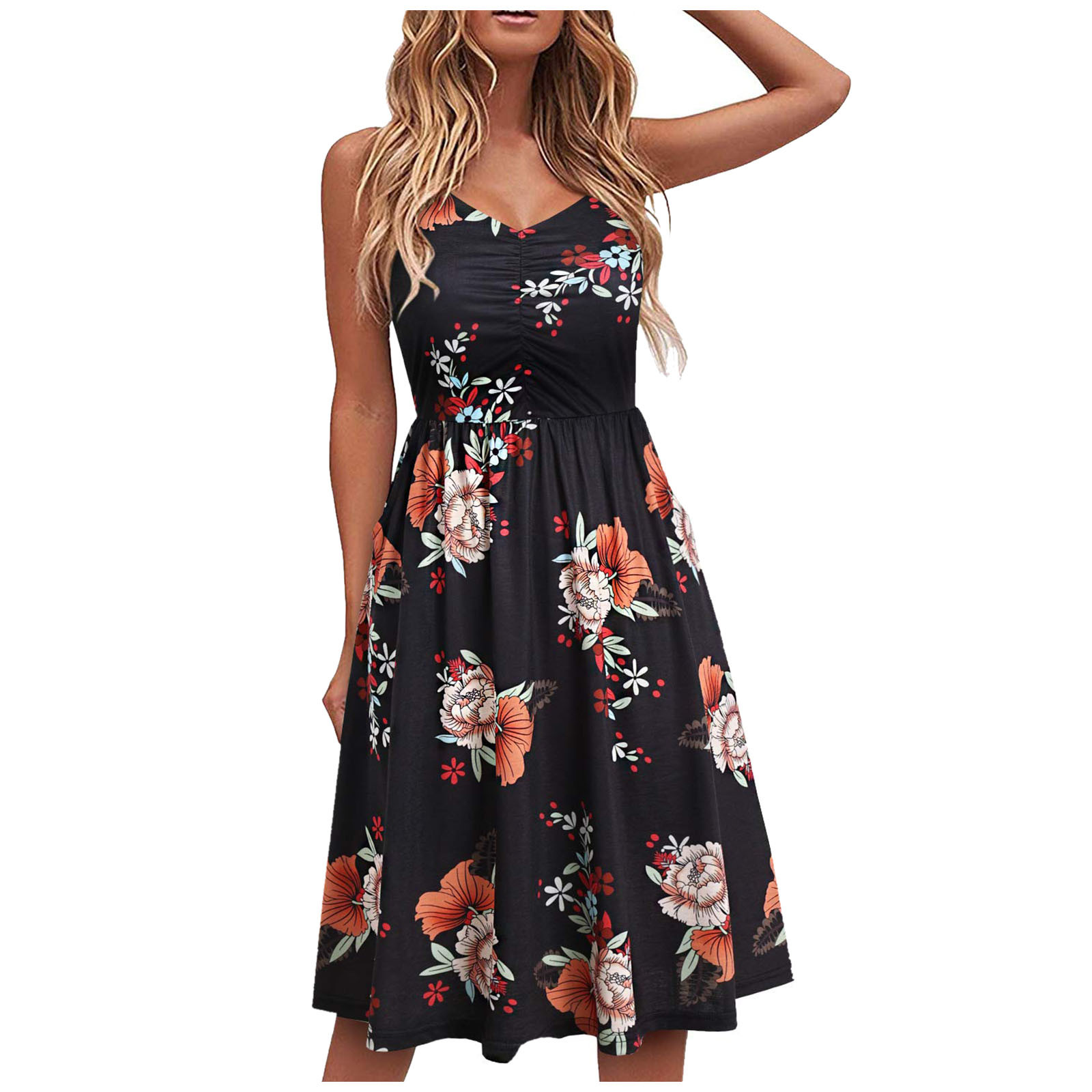 Women Sling Floral Dresses Summer V-Neck Sleeveless Party Beach Floarl Print Dress