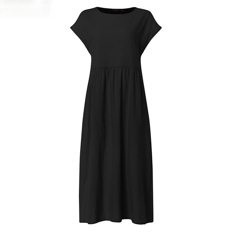 Summer Midi Dress Womens Sundress Vintage Short Sleeve Shirt O Neck Pleated Robe Plus Size