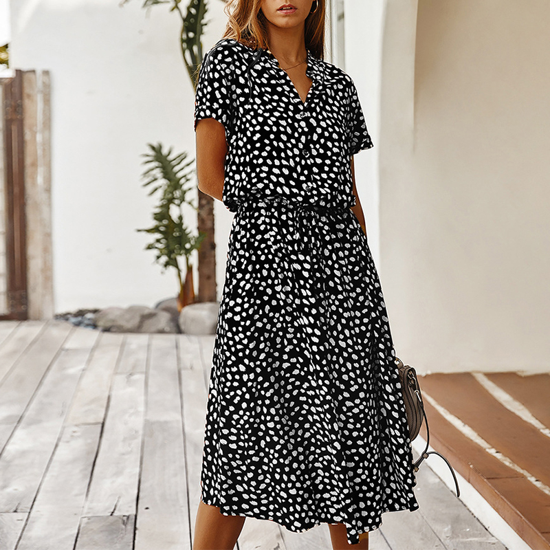 Fashion Women Dresses Summer Boho Dot Print High Waist Shirt Dress