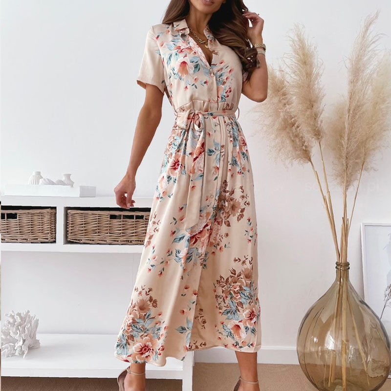 Summer Short Sleeve Long Dresses Office Ladies Turn Down Collar Spli Dresses