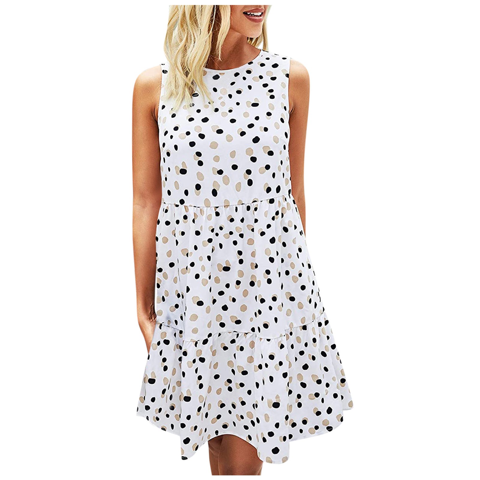 Women Summer Dot Prints Sleeveless A Line Loose Swing T Shirt Dress with Pockets